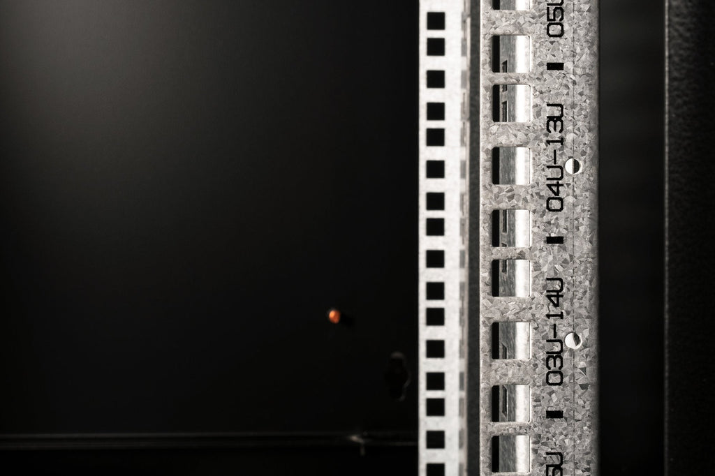 - Carriles de perfil de 483 mm (19'') instalados en la parte delantera y trasera del armario, galvanizados