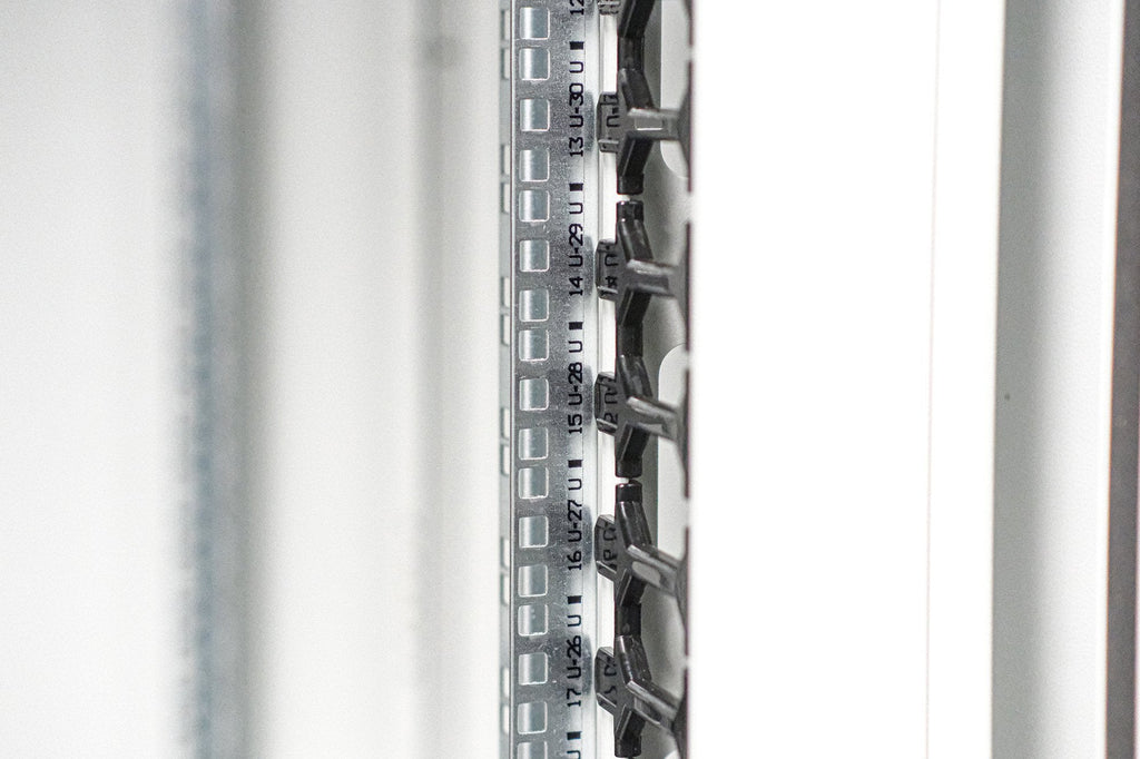 - Amplios canales para cables verticales con anillos guiacables y panel instalados en la parte frontal
