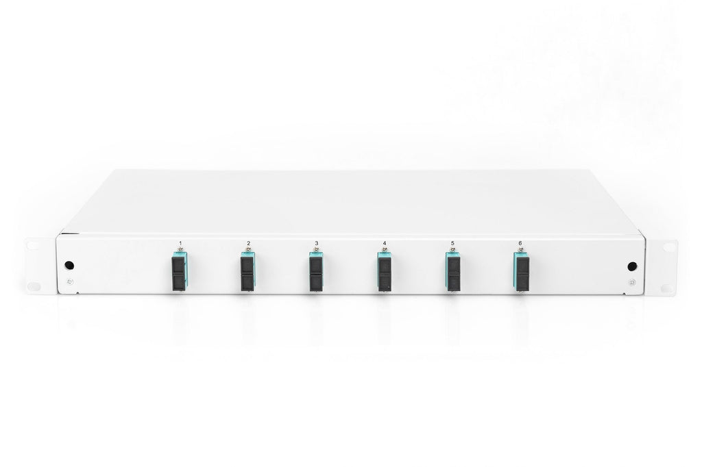 Caja de empalme de fibra óptica, 1U, equipada, 6x SC DX, OM3, incl. casete de empalme, latiguillos de colores, acoplamientos