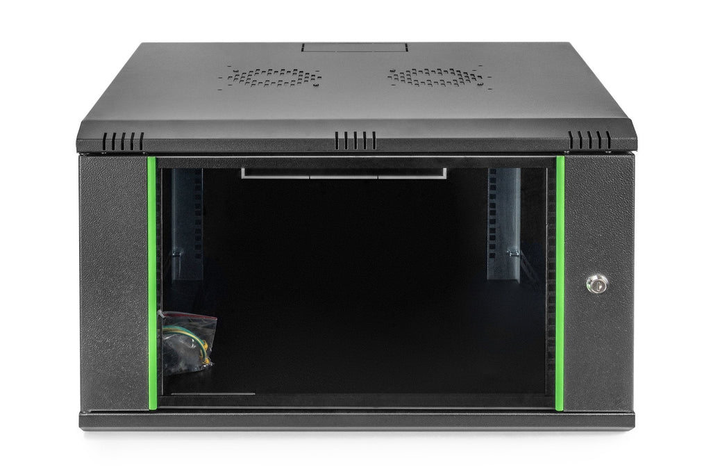 Los armarios de red para el montaje en la pared de la serie Dynamic han sido desarrollados para la ampliación sencilla y especialmente económica de redes. El techo, la base y la pared trasera de cada armario poseen una entrada para cables pretroquelada. Para el alojamiento de un módulo ventilador se incluye además una zona troquelada en el chasis de techo. En el interior están instalados dos pares de guías de perfil de 483 mm (19") galvanizadas y rotuladas con unidades de altura legibles desde ambos lados. Estas se pueden ajustar en profundidad. Cada armario es una robusta construcción de acero, hecha de chapa de acero con un grosor de hasta 1,5 mm. El proceso de pintado se realiza en forma de un recubrimiento de polvo electrostático en los colores estándar gris (RAL 7035) y negro (RAL 9005). Las paredes laterales desmontables y la puerta frontal desmontable y con cerradura facilitan el acceso. Es posible cambiar de lado las bisagras de las puertas. El montaje en la pared se realiza en dos pasos sencillos: La chapa de montaje se atornilla en la pared y se conecta después con la carcasa.