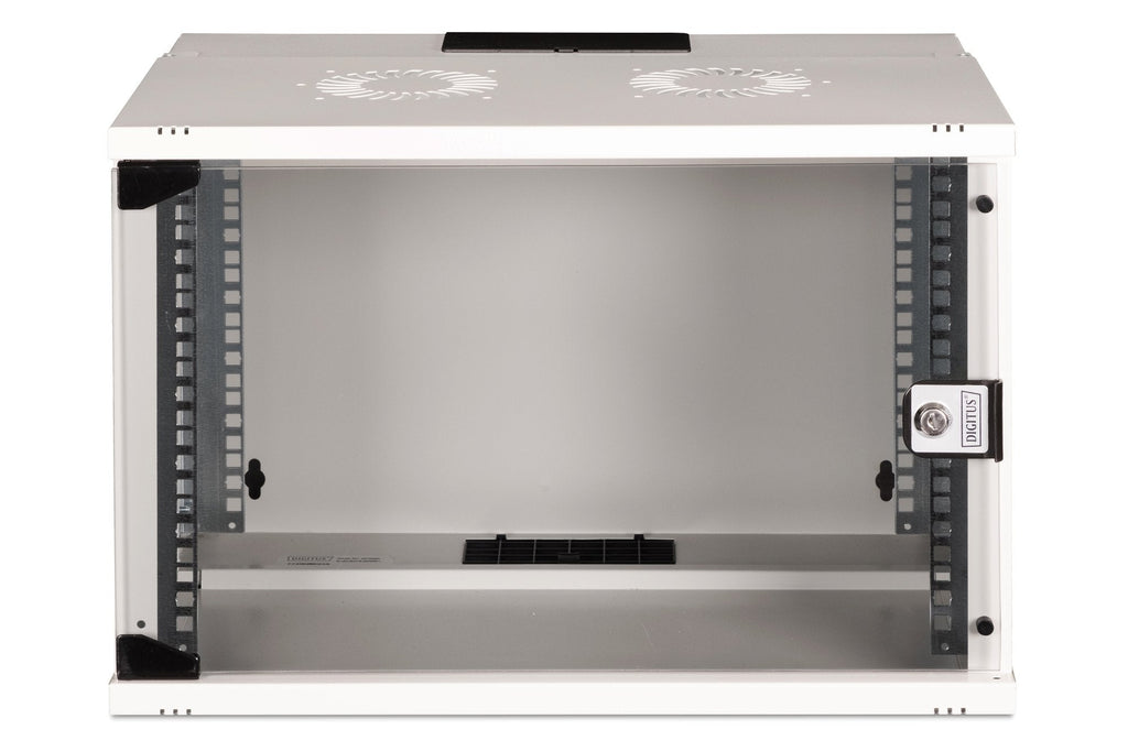 La serie de armarios murales DIGITUS® SOHO PRO se caracteriza por su eficaz entrega en un paquete plano optimizado y su instalación especialmente sencilla.