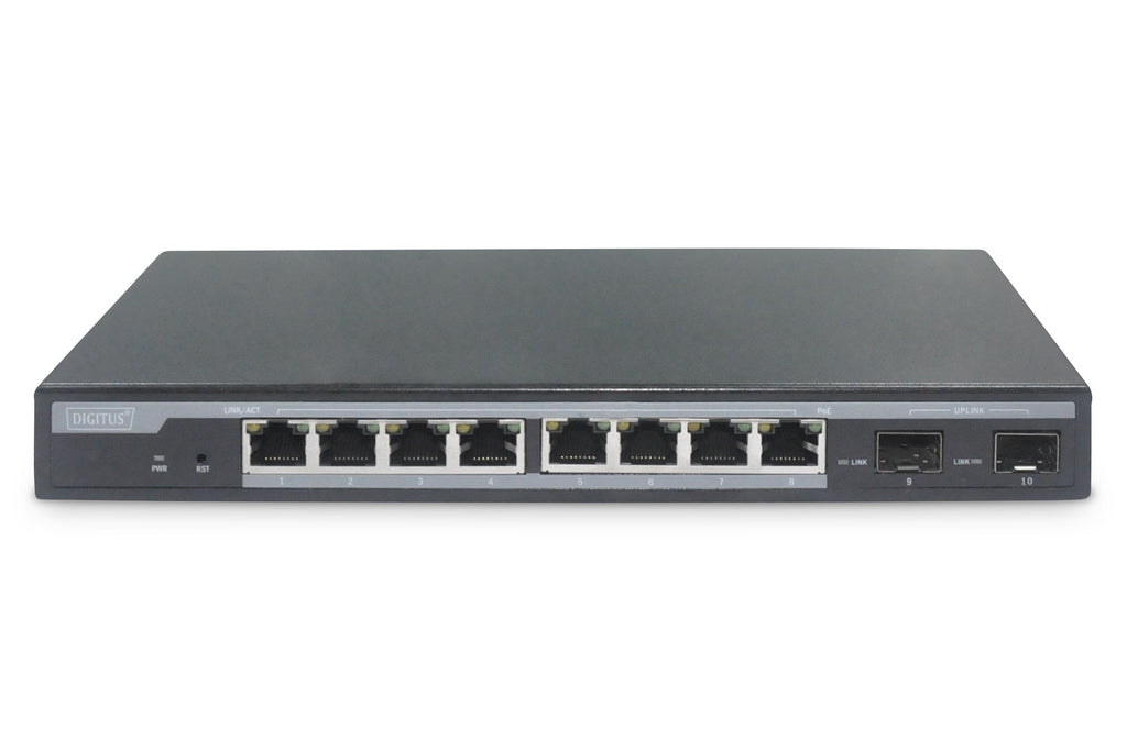 El conmutador Gigabit PoE gestionado L2 DIGITUS® con 8 puertos PoE+ y 2 puertos SFP Gigabit es ideal para usar en diferentes topologías de red, como por ejemplos en PYME. Las amplias opciones de configuración de L2 pueden aumentar el rendimiento y la eficiencia de su red. El conmutador ofrece la posibilidad de segmentar la red a través de VLAN; la función QoS garantiza un intercambio de datos sin problemas en aplicaciones con plazos de tiempo ajustados. Usando el protocolo Spanning Tree o el puerto troncal, se puede crear una protección contra fallas cuando se conecta a otros conmutadores. La gestión de conmutadores se puede realizar a través de la interfaz web, SNMP, SSH o Telnet.
