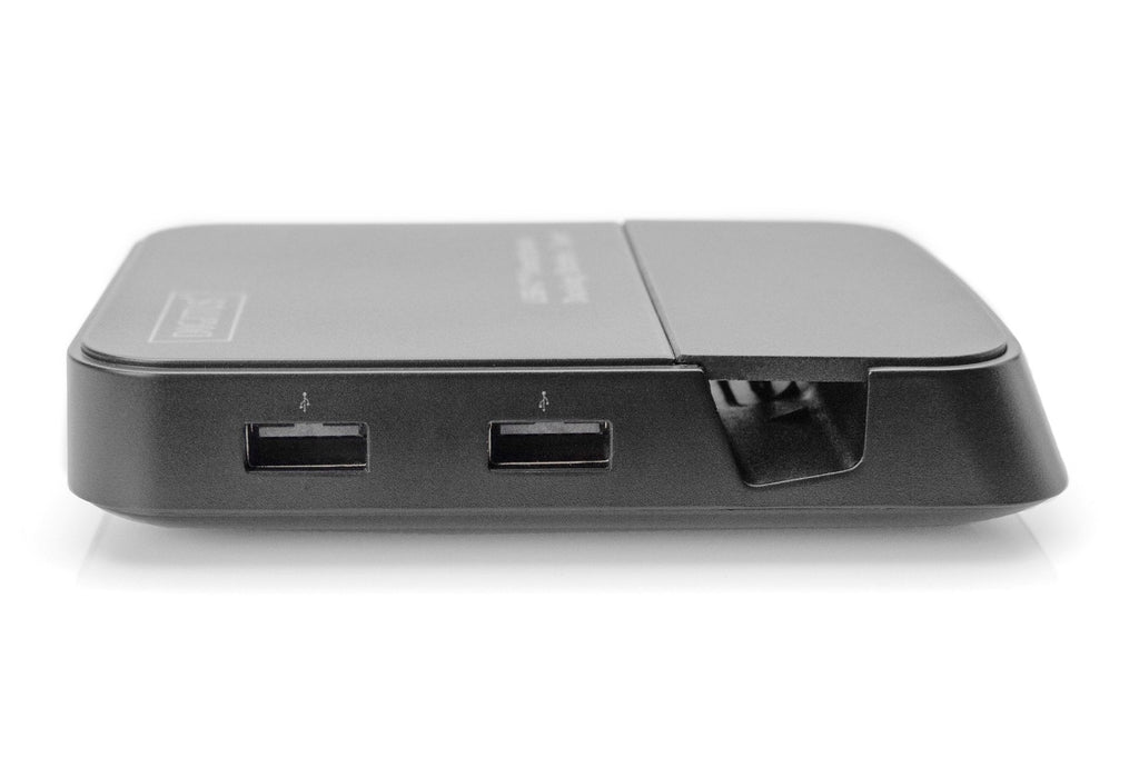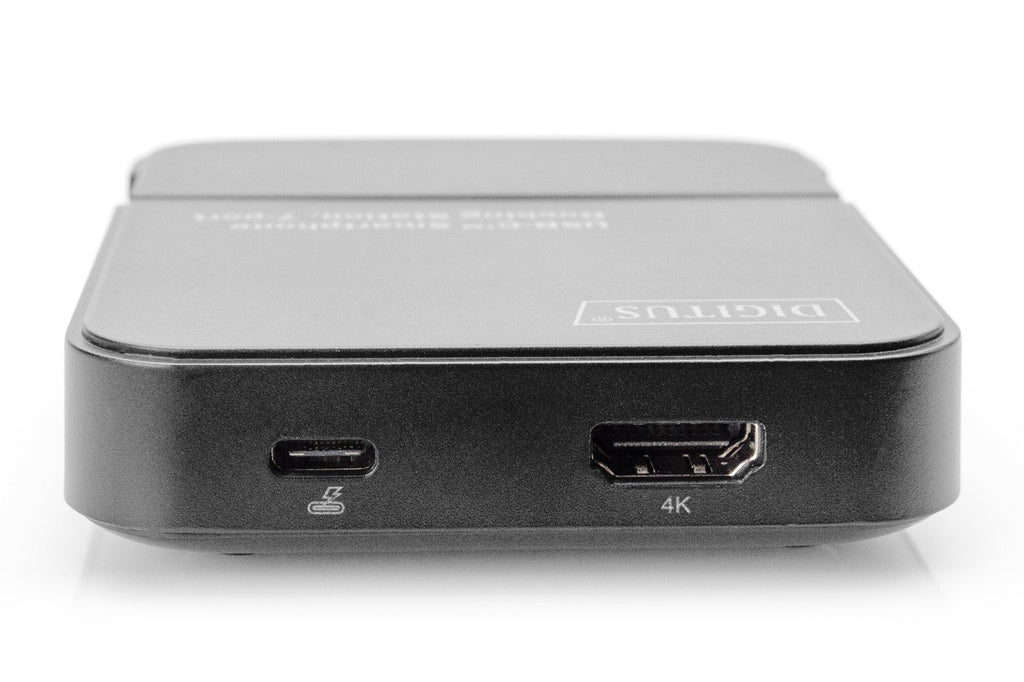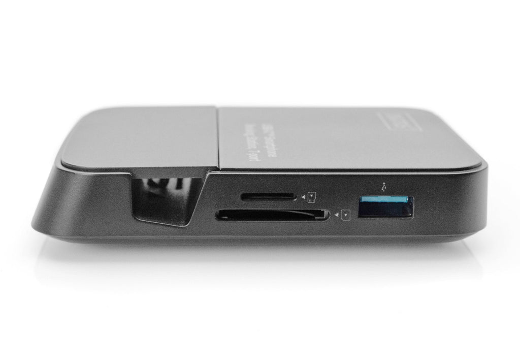 ¿Utilizar su smartphone como equipo de sobremesa? No es ningún problema con su estación de acoplamiento para smartphone de DIGITUS®. No solo puede disfrutar del contenido de su smartphone en excelente calidad UHD en una pantalla conectada, sino que, además, puede utilizar su smartphone en modo escritorio como un PC normal. Con el teclado y el ratón conectados, la estación de acoplamiento apenas se diferencia de un ordenador convencional. Ideal para viajar, cuando no tenga un notebook a mano o también para utilizarlo en casa, por ejemplo, para reproducir vídeos, fotos de las vacaciones u otros documentos directamente en una pantalla de gran tamaño. En la interfaz HDMI® pueden conectarse pantallas con una resolución UHD de hasta 4K a 30 Hz. Asimismo, dispone de otras dos interfaces USB 2.0, p. ej. para el teclado y el ratón, así como un puerto USB 3.0 para otros dispositivos con altas velocidades de transferencia, como discos duros o memorias USB. El lector de tarjetas integrado para tarjetas de memoria SD y microSD permite la administración de sus medios y datos. Las posibilidades de aplicación no deja nada que desear. Convierta su smartphone en un equipo de sobremesa con la estación de acoplamiento de 7 puertos de DIGITUS®.