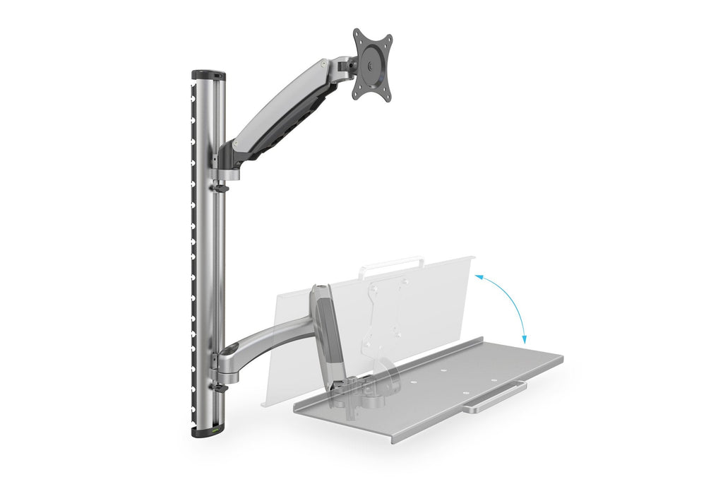 Soporte de pared universal para la instalación del monitor y el teclado con ajuste flexible de la altura de trabajo. Establezca un lugar de trabajo en el que con dos rápidas maniobras se pueda ajustar a la altura corporal de varias personas a pesar de las diferencias de tamaño. Al seleccionar el soporte es necesario que tenga en cuenta la medida VESA y que compruebe el peso de su monitor para asegurar la compatibilidad.