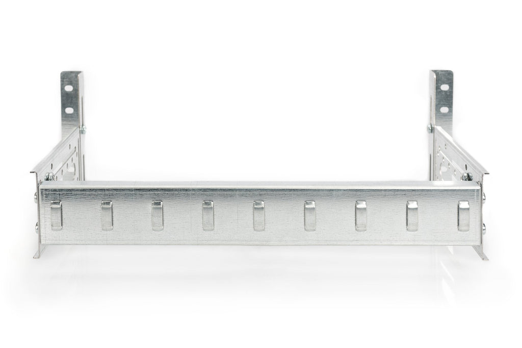El soporte de carril DIN de 483 mm (19 pulgadas) aloja dispositivos de carril DIN en un carril DIN estándar con un ancho de 390 mm. Su profundidad es ajustable y puede girarse hacia arriba o hacia abajo 90° si es necesario para el montaje horizontal del dispositivo. La parte posterior tiene un carril C ajustable en altura con puntos de sujeción especiales para bandas de bridas para lograr un óptimo cableado. El soporte completo es ajustable en altura para adaptarse a las necesidades de espacio individuales (los soportes de montaje 4U se instalan permanentemente en el armario).