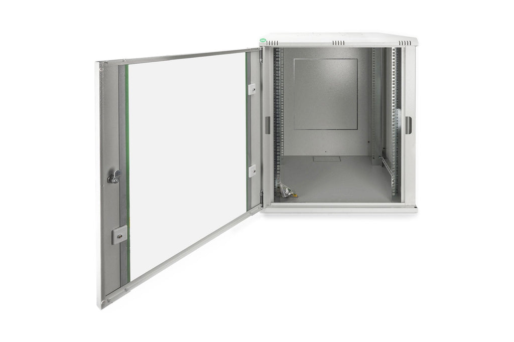 Los armarios de red para el montaje en la pared de la serie Dynamic han sido desarrollados para la ampliación sencilla y especialmente económica de redes. El techo, la base y la pared trasera de cada armario poseen una entrada para cables pretroquelada. Para el alojamiento de un módulo ventilador se incluye además una zona troquelada en el chasis de techo. En el interior están instalados dos pares de guías de perfil de 483 mm (19") galvanizadas y rotuladas con unidades de altura legibles desde ambos lados. Estas se pueden ajustar en profundidad. Cada armario es una robusta construcción de acero, hecha de chapa de acero con un grosor de hasta 1,5 mm. El proceso de pintado se realiza en forma de un recubrimiento de polvo electrostático en los colores estándar gris (RAL 7035) y negro (RAL 9005). Las paredes laterales desmontables y la puerta frontal desmontable y con cerradura facilitan el acceso. Es posible cambiar de lado las bisagras de las puertas. El montaje en la pared se realiza en dos pasos sencillos: La chapa de montaje se atornilla en la pared y se conecta después con la carcasa.