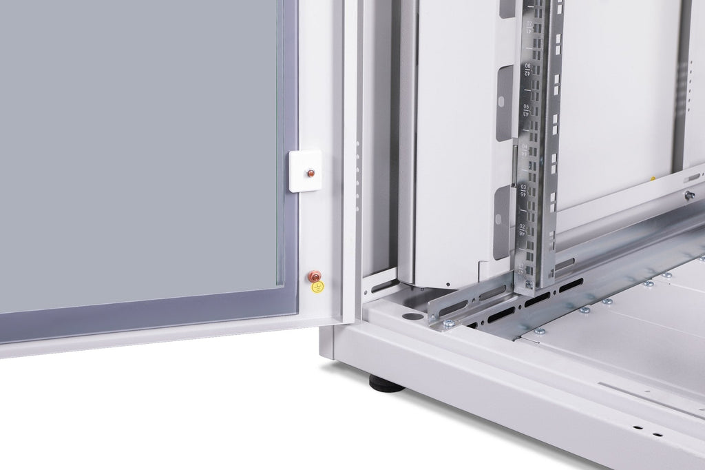 Los armarios de red de la serie Unique se han diseñado y fabricado para un cableado de red especialmente cómodo y flexible. Las sofisticadas optimizaciones ofrecen una estabilidad acorde con el mercado con la máxima flexibilidad. Un chasis base modular, que puede abrirse mediante paneles ciegos atornillados de 483 mm (19"), ofrece espacio suficiente para cables de todo tipo. Además, hay entradas de cables laterales con escobillas en la parte superior e inferior del armario, así como otra en la parte trasera del chasis base. Las regletas de escobillas traseras por encima y por debajo de la puerta trasera (a partir de 26U) permiten su uso en una amplia gama de escenarios de aplicación. Los amplios conductos de cables verticales con ayudas para el guiado de cables y tapa, instalados en la parte delantera (a partir de 800 mm de ancho de armario), completan a la perfección las versátiles características del armario de red. En el interior hay instalados dos pares de carriles de perfil de 483 mm (19") galvanizados y con manivela, etiquetados con unidades de altura que pueden leerse en direcciones opuestas. Se pueden ajustar de forma continua y están conectados a puntales de profundidad adicionales en el armario. Cada armario es una robusta construcción de chapa de acero de hasta 1,5 mm de grosor. La coloración se realiza mediante recubrimiento electrostático en polvo en los colores estándar gris (RAL 7035) y negro (RAL 9005). Los paneles laterales y las puertas modulares bloqueables y desmontables mejoran la accesibilidad. Las bisagras de las puertas se pueden cambiar. Además, los armarios pueden desmontarse completamente en caso necesario gracias a su diseño desmontable.