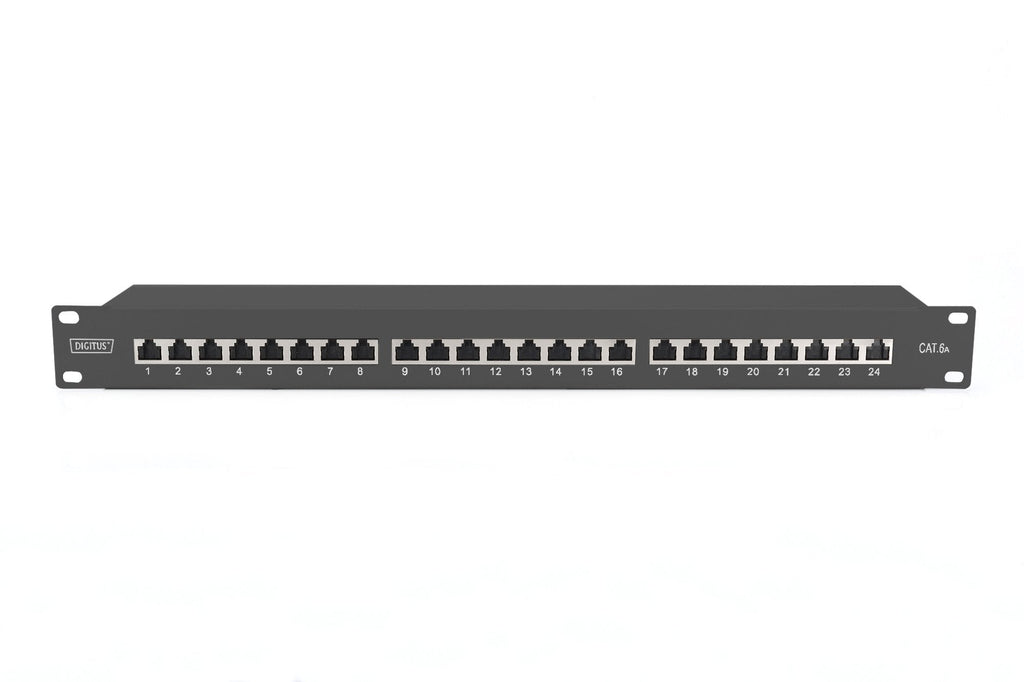 El panel de conexiones CAT 6A DIGITUS® "DN-91624S-EA" está disponible en versión de 24 puertos y, con su acero laminado en frío galvanizado de 1,5 mm, es un robusto panel de conexiones para montaje en bastidor de 19". Cumple las normas 802.3at PoE+ y 802.3af PoE y está equipado con tapas de protección contra el polvo.