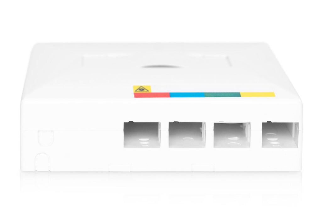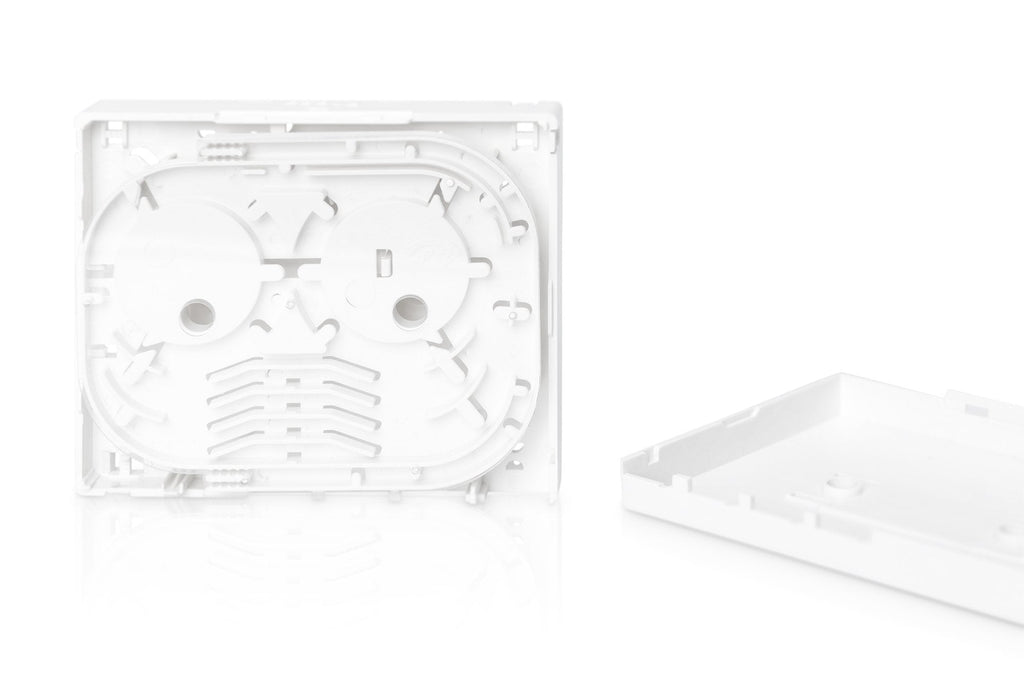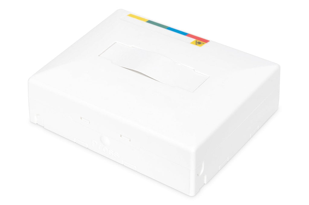 La carcasa FTTX vacía puede alojar hasta 4 fibras ópticas y distribuirlas a 4 terminales con la ayuda de los acoplamientos adecuados. Permite la colocación de 4 acoplamientos SC Simplex o 4 acoplamientos LC Duplex (sin brida). La carcasa está formada por una placa frontal, la carcasa con una caja de empalme desplegable y una cubierta de plástico transparente para la protección adicional de los cables de fibra óptica empalmados. La caja se puede montar en la pared o encajar en un raíl DIN. Integre el empalme de fibras, la terminación, el almacenamiento y la conexión en un espacio mínimo gracias a la carcasa FTTX vacía ultracompacta de DIGITUS®.