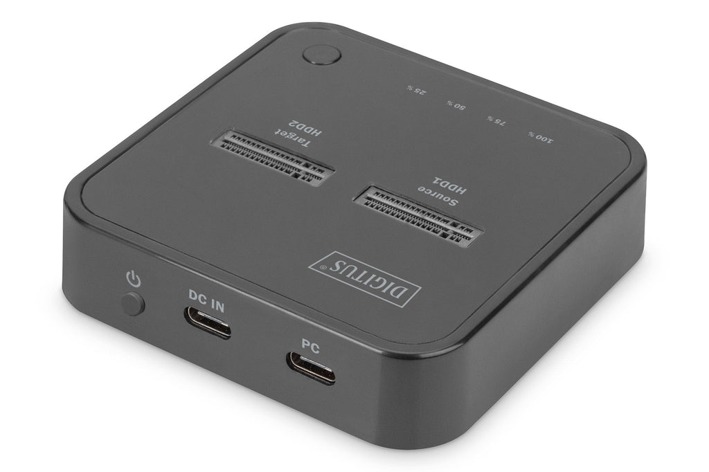 La estación de acoplamiento dual NVMe de DIGITUS® puede alojar SSD M.2 de hasta 4 TB por ranura. Gestione un total de 2 SSD en diferentes formatos con una capacidad de memoria total de hasta 8 TB. La función de clonación offline integrada permite incluso duplicar soportes de memoria sin ningún terminal conectado, pulsando simplemente un botón. El avance del proceso de copia se visualiza mediante indicadores LED en el dispositivo. Compatible con SSD M-Key y B&M-Key NVMe en los formatos usuales 2242, 2260, 2280 y 22110. Amplíe de manera sencilla la capacidad de memoria de numerosos dispositivos USB-C™ como PC, notebooks, televisores, consolas de juegos o routers.