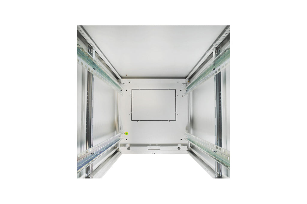 Los armarios de red de la serie Dynamic se han desarrollado para ampliar la red de forma sencilla y especialmente rentable. La sofisticada colocación de las entradas de cables garantiza una instalación sin esfuerzo en función de la aplicación. En los chasis de suelo, ésta se encuentra en el centro de la zona trasera, protegida por una placa de cubierta atornillada. Los armarios a partir de 800 mm de ancho se amplían adicionalmente con entradas de cables con tapas de plástico a izquierda y derecha. Éstas también están integradas en el techo (1 x para anchura de armario de 600 mm, 3 x para anchura de armario de 800 mm). El chasis del techo dispone además de una zona troquelada para alojar un módulo de ventilador. En el interior hay instalados dos pares de raíles perfilados galvanizados de 483 mm (19"), etiquetados con unidades de altura legibles en ambas direcciones. Pueden ajustarse en profundidad y están conectados a puntales de profundidad adicionales en el armario. Cada armario es una robusta construcción de chapa de acero de hasta 1,5 mm de grosor. La coloración se realiza mediante recubrimiento electrostático en polvo en los colores estándar gris (RAL 7035) y negro (RAL 9005). Los paneles laterales y traseros extraíbles, así como la puerta delantera con cerradura y extraíble, mejoran la accesibilidad. Las bisagras de la puerta pueden cambiarse. Además, los armarios pueden desmontarse completamente en caso necesario gracias a su diseño desmontable.