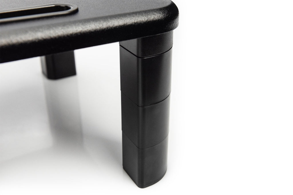 La elevación del monitor de altura ajustable le ayuda a personalizar su lugar de trabajo. Gracias a la estructura modular de los pies, puede aumentar la altura de manera flexible en 3 pasos y colocar su tablet o smartphone en la zona delantera.