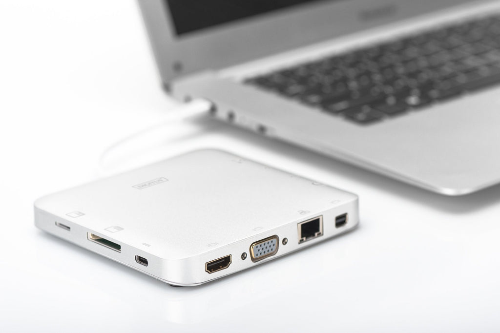 La estación de acoplamiento universal de funcionamiento pleno USB Type-C™ de DIGITUS® le ofrece todo lo necesario para crear una estación de trabajo con todas las funciones. Proporciona tres interfaces de vídeo (HDMI, mini DP, VGA), pudiendo manejarse dos monitores simultáneamente. Resolución máxima soportada: UHD nítida (4K2K/30 Hz). Para ello dispone de tres puertos USB 3.0, ofreciendo un puerto (5 V/1,5 A) adicional que garantiza una función de carga para dispositivos móviles. Las interfaces USB se complementan por medio de un puerto USB-C™ con función Power Delivery (PD 2.0). Asimismo, cuenta con dos lectores de tarjetas (MicroSD, SDHC, SDXC/MMC). El puerto Gigabit Ethernet permite conectar su portátil por cable a la red. El conjunto se complementa con una conexión de audio estéreo. Añada a su portátil 11 conexiones adicionales mediante un único puerto USB C™ con la estación de acoplamiento universal y multifuncional USB Type-C™.