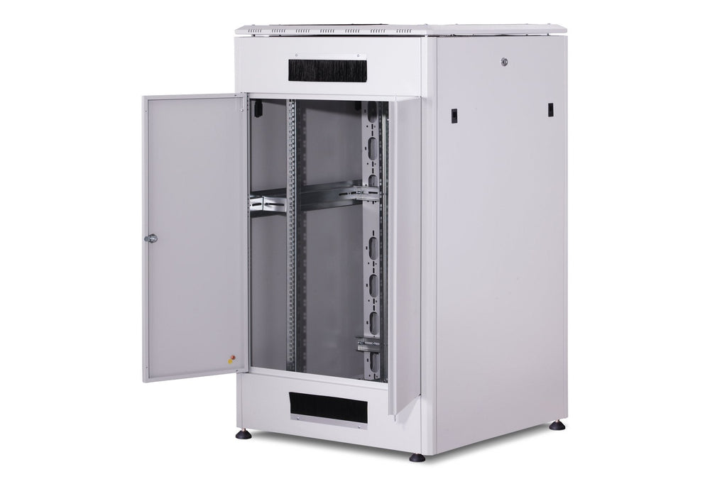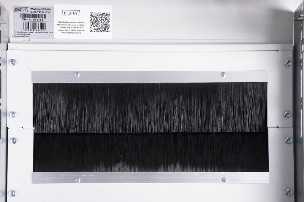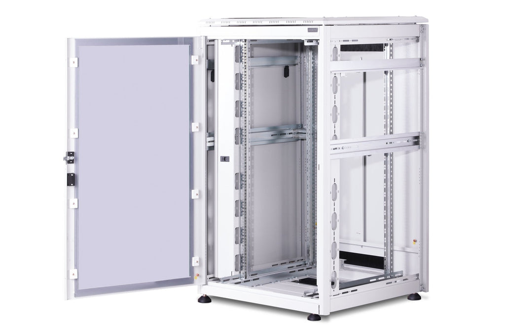 Los armarios de red de la serie Unique se han diseñado y fabricado para un cableado de red especialmente cómodo y flexible. Las sofisticadas optimizaciones ofrecen una estabilidad acorde con el mercado con la máxima flexibilidad. Un chasis base modular, que puede abrirse mediante paneles ciegos atornillados de 483 mm (19"), ofrece espacio suficiente para cables de todo tipo. Además, hay entradas de cables laterales con escobillas en la parte superior e inferior del armario, así como otra en la parte trasera del chasis base. Las regletas de escobillas traseras por encima y por debajo de la puerta trasera (a partir de 26U) permiten su uso en una amplia gama de escenarios de aplicación. Los amplios conductos de cables verticales con ayudas para el guiado de cables y tapa, instalados en la parte delantera (a partir de 800 mm de ancho de armario), completan a la perfección las versátiles características del armario de red. En el interior hay instalados dos pares de carriles de perfil de 483 mm (19") galvanizados y con manivela, etiquetados con unidades de altura que pueden leerse en direcciones opuestas. Se pueden ajustar de forma continua y están conectados a puntales de profundidad adicionales en el armario. Cada armario es una robusta construcción de chapa de acero de hasta 1,5 mm de grosor. La coloración se realiza mediante recubrimiento electrostático en polvo en los colores estándar gris (RAL 7035) y negro (RAL 9005). Los paneles laterales y las puertas modulares con cerradura y extraíbles mejoran la accesibilidad. Las bisagras de las puertas pueden cambiarse. Además, los armarios pueden desmontarse completamente en caso necesario gracias a su diseño desmontable.