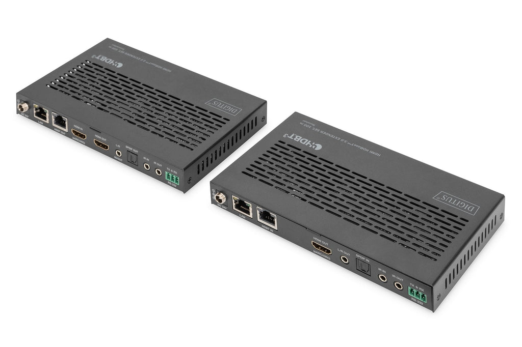 El kit extensor DIGITUS® HDMI HDBaseT™ 3.0 permite la transmisión de señales AV sin comprimir en 4K/60Hz, 4:4:4 con 18 Gbps a una distancia de 100 m mediante un cable CAT 6A (o superior). Tanto en el emisor como en el receptor se encuentran dos puertos USB-A «Device» y una conexión USB-B «Host». De este modo, las señales USB, p. ej., para KVM, soportes de datos USB, etc., se pueden integrar en ambos extremos y conectar en el respectivo extremo opuesto al PC encargado del procesamiento. Un interruptor DIP permite conmutar en ambos dispositivos entre los modos «Host» y «Device». El sistema permite la transmisión bidireccional de PoC (Power over Cable) e IR. Vía RS232 se pueden controlar ambos dispositivos por separado. También está disponible un desacoplamiento de audio estéreo analógico. Otra característica destacada es la versátil compatibilidad eARC/ARC que permite establecer la conexión con dispositivos de audio nuevos y antiguos, tales como ARV (Audio Video Receiver). En este ámbito se dispone de dos modos (ARC, S/PDIF) que también se pueden cambiar muy fácilmente mediante un conmutador.