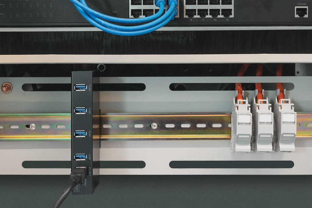 El concentrador USB 3.0 industrial DIGITUS® es ideal para aplicaciones industriales gracias a su carcasa metálica. Puede montarse en la pared o en un carril portante y se conecta a un ordenador, portátil o servidor con el cable USB 3.0 suministrado. El concentrador soporta USB 3.0 superspeed con una velocidad de transferencia de datos de hasta 5 Gbit/s y es compatible con USB 2.0 y USB 1.1. El concentrador puede alimentarse a través de una conexión de regleta de terminales de dos hilos (+9 V a 24 V). Opcionalmente, se puede conectar una fuente de alimentación externa a la toma de CC.