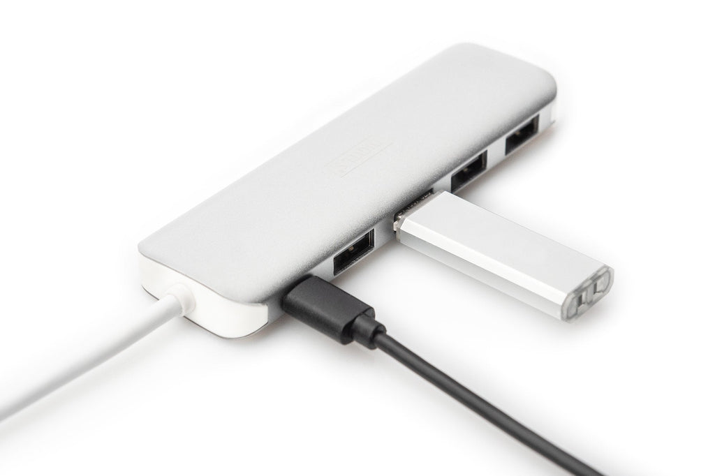 Con este concentrador de 4 puertos USB Type-C™, puede añadir a su ordenador portátil existente cuatro puertos USB 3.0 con el puerto USB-C™. Use hasta otros cuatro dispositivos USB, como un ratón, teclado o memorias USB en su ordenador portátil. Además, en el concentrador hay un puerto USB-C™ (PD) que le permite cargar su ordenador portátil. El concentrador USB-C™ de 4 puertos de Digitus es el compañero ideal para viajar, pero también en el hogar y la oficina gracias a su fino diseño.