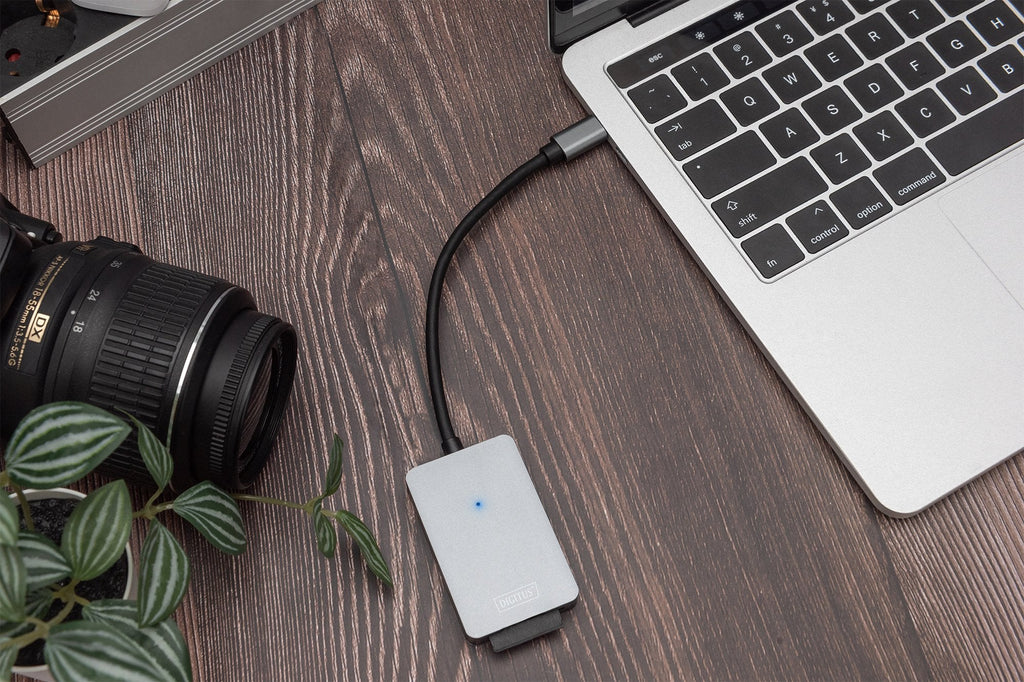 El lector de tarjetas USB-C SD de DIGITUS permite la transmisión extremadamente rápida de sus datos al PC o Mac. Tiene la posibilidad de utilizar tarjetas de memoria UHS-II SD 4.0 y transferir datos con una velocidad de 300 Mb/s.
