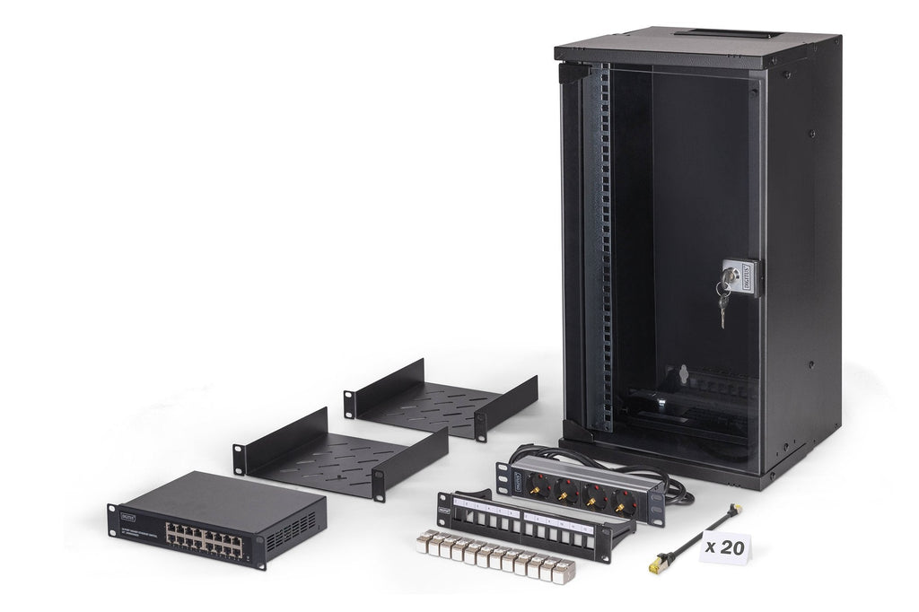 Juego completo para montar una red compacta de 254 mm (10"), incl. armario, estante, regleta de enchufes, conmutador, panel de conexiones, módulos Keystone, cables de conexión.