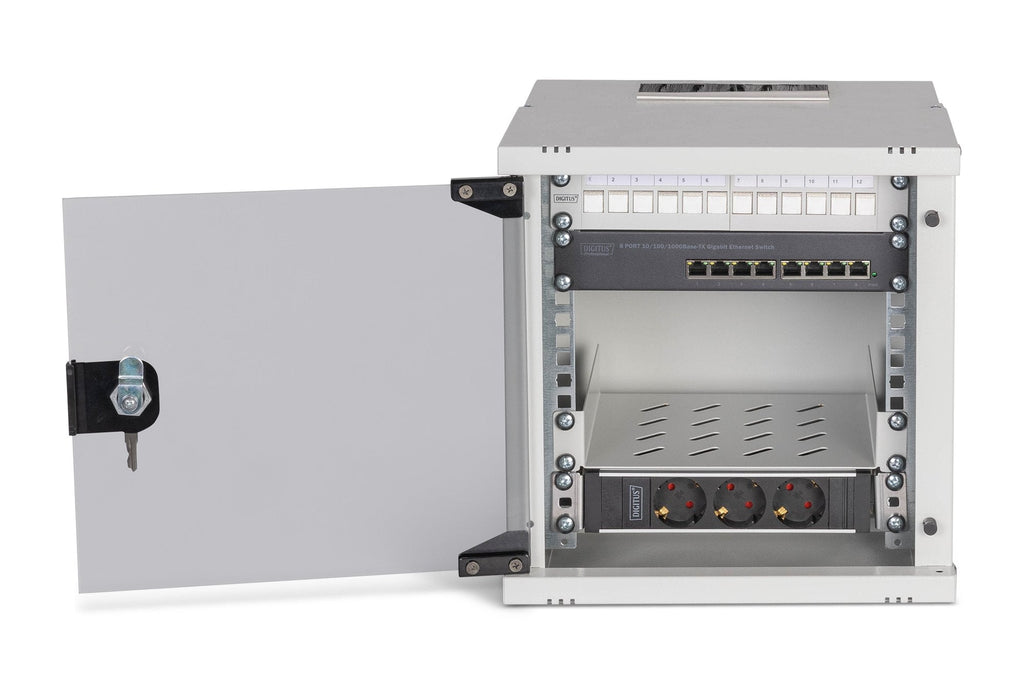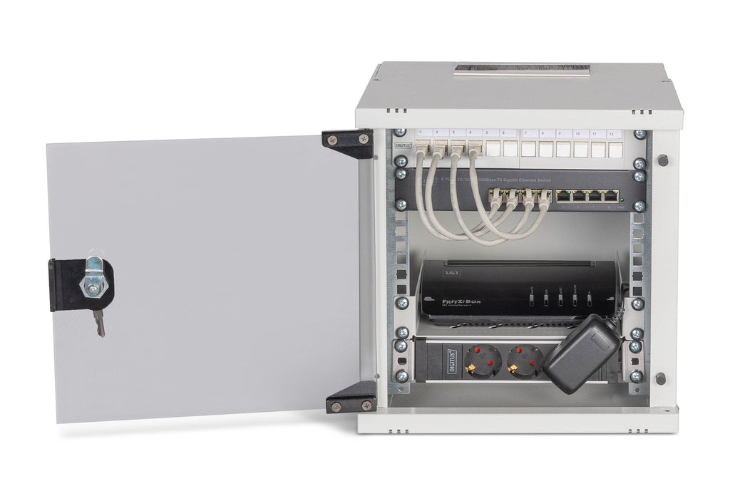 Juego completo para montar una red compacta de 254 mm (10"), incl. armario, estante, regleta de enchufes, conmutador, panel de conexiones, módulos Keystone, cables de conexión.