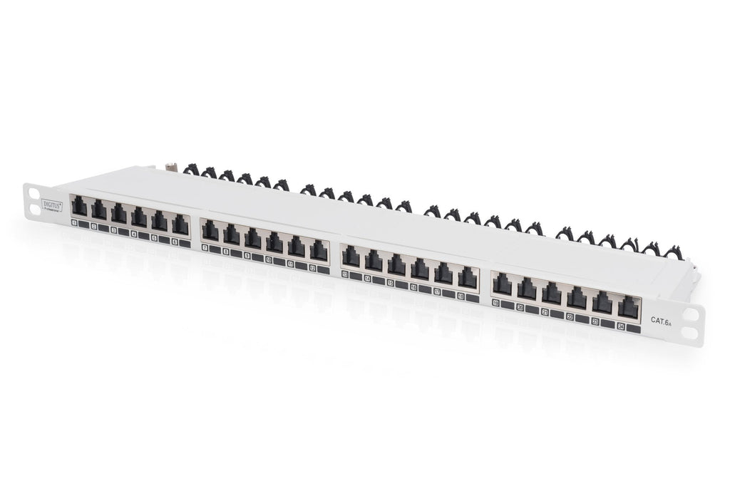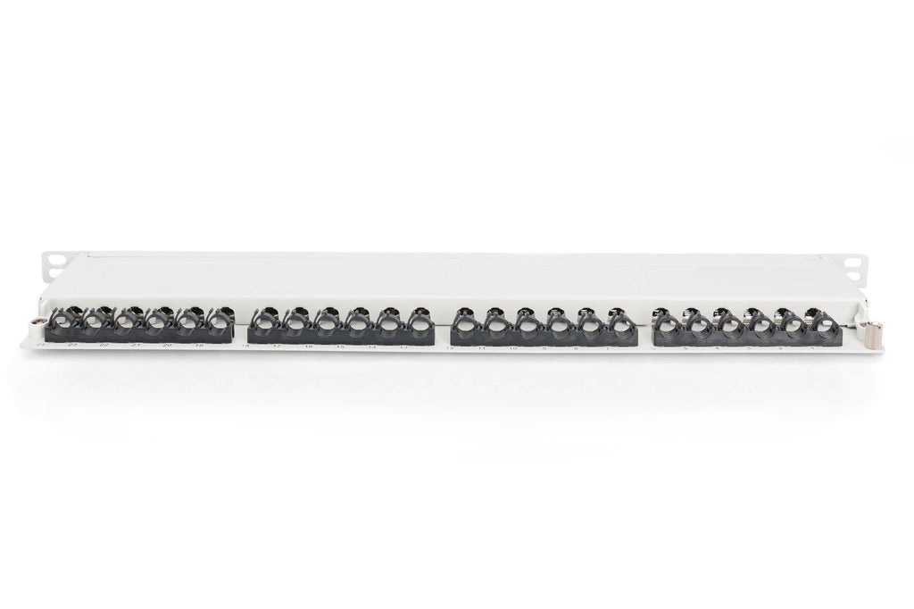 El panel de conexiones DIGITUS® de 24 puertos ofrece una densidad de empaquetamiento muy alta con sólo 0,5 U. Esto significa que se pueden realizar hasta 48 puertos en 1 U con dos paneles de 0,5 U. El panel de conexiones está apantallado y equipado con tapas de protección contra el polvo en las tomas RJ45. El contacto de apantallamiento de 360° de los cables garantiza las mejores características de rendimiento. El cierre rápido de la carcasa garantiza un acceso fácil y sin herramientas a los terminales de corte LSA.