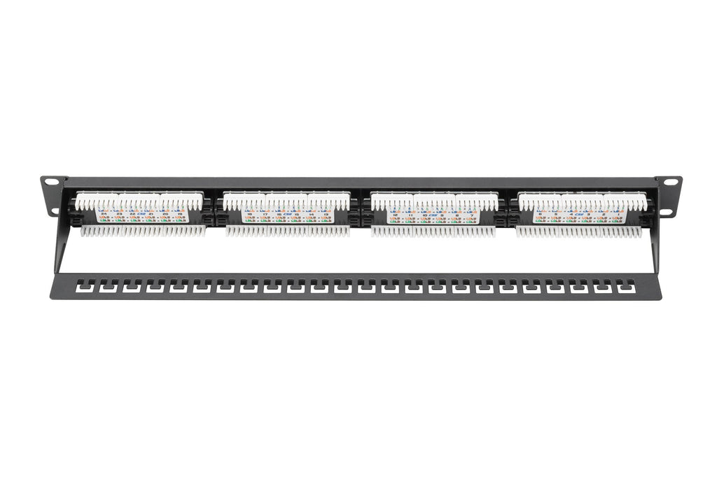El panel de conexión CAT 6 sin apantallar de DIGITUS® está disponible con 16 o 24 puertos (1 unidad rack) o 48 puertos (2 unidades rack). Fabricado y certificado por UL de conformidad con los requisitos del Enlace de Rendimiento de clase E, para hasta 250 MHz, ISO/IEC 11801 y EN 50173. La carcasa está hecha de acero laminado de 1,5 mm galvanizado en frío y por ello es perfecta para montaje en armarios de 19".