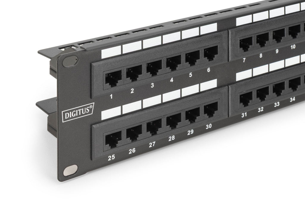El panel de conexión CAT 6 sin apantallar de DIGITUS® está disponible con 16 o 24 puertos (1 unidad rack) o 48 puertos (2 unidades rack). Fabricado y certificado por UL de conformidad con los requisitos del Enlace de Rendimiento de clase E, para hasta 250 MHz, ISO/IEC 11801 y EN 50173. La carcasa está hecha de acero laminado de 1,5 mm galvanizado en frío y por ello es perfecta para montaje en armarios de 19".