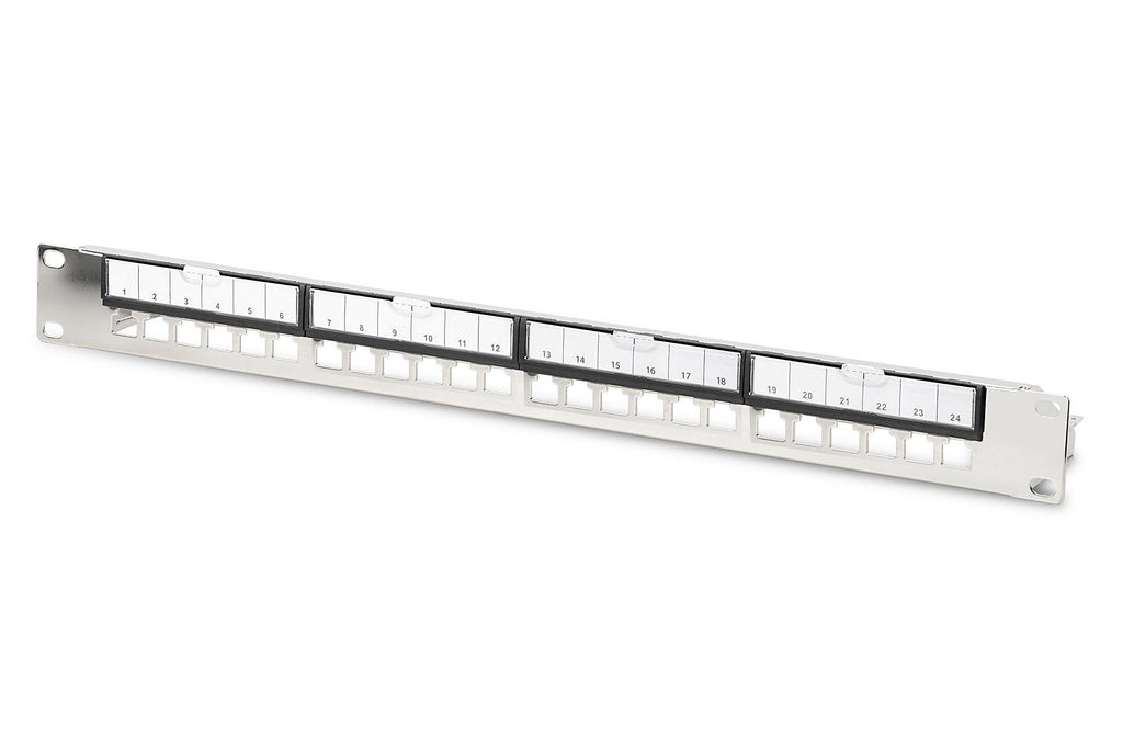 El panel de conexiones modular Digitus, de 24 puertos, ofrece configuraciones de red flexibles, una robusta construcción de acero galvanizado y una gestión sencilla gracias a los puertos numerados.