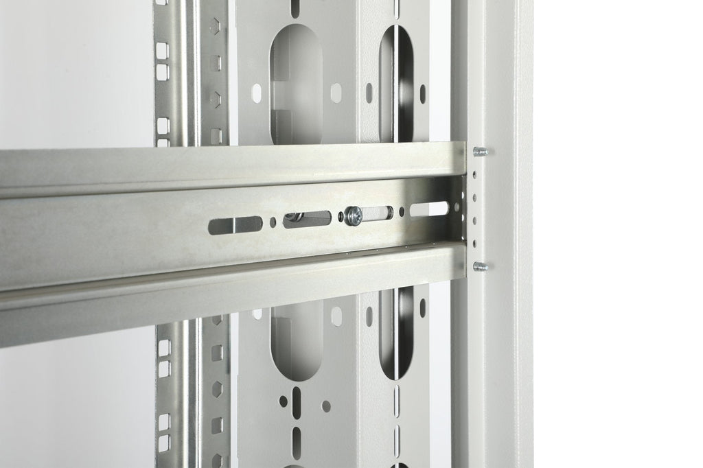 - Los raíles de perfil de 483 mm (19") están conectados a puntales de profundidad para aumentar la estabilidad