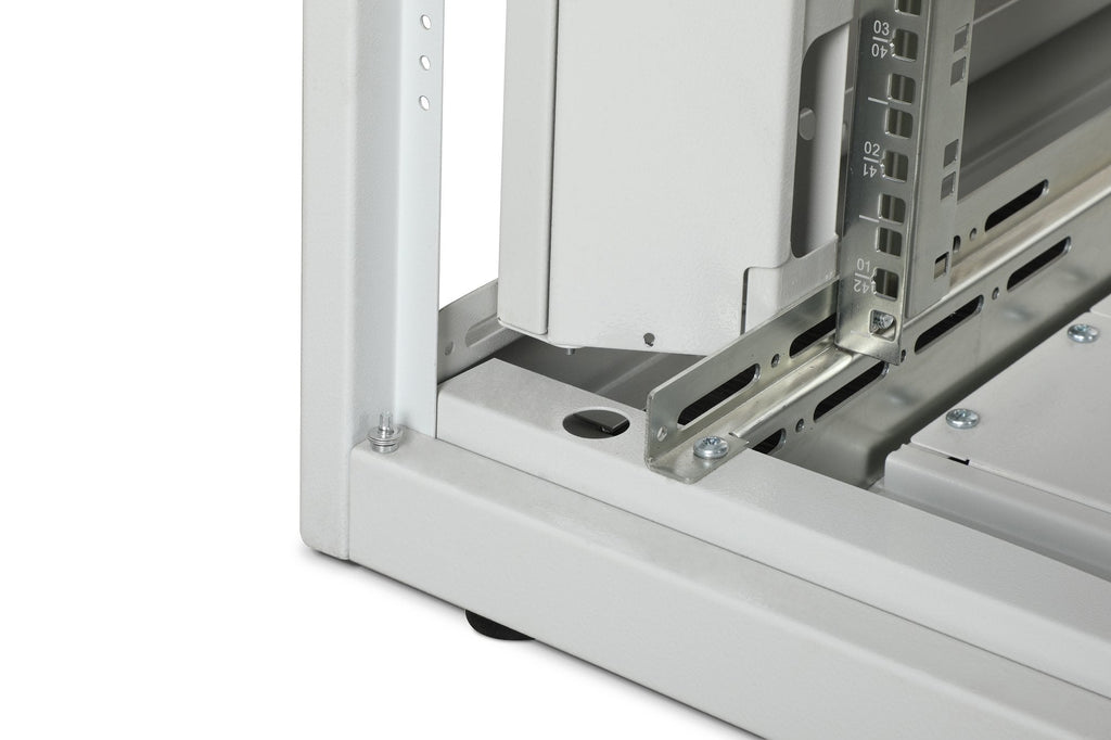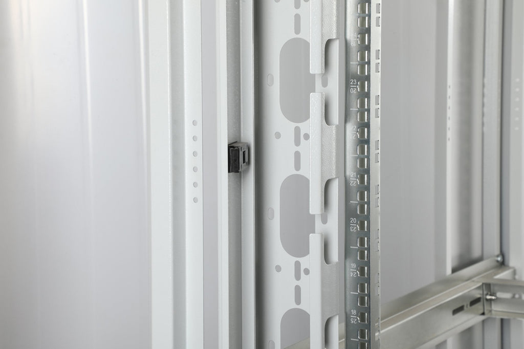 Los armarios de red de la serie Unique se han diseñado y fabricado para un cableado de red especialmente cómodo y flexible. Las sofisticadas optimizaciones ofrecen una estabilidad acorde con el mercado con la máxima flexibilidad. Un chasis base modular, que puede abrirse mediante paneles ciegos atornillados de 483 mm (19"), ofrece espacio suficiente para cables de todo tipo. Además, hay entradas de cables laterales con escobillas en la parte superior e inferior del armario, así como otra en la parte trasera del chasis base. Los generosos conductos de cables verticales con ayudas y tapas para el guiado de cables, instalados en la parte delantera (a partir de 800 mm de ancho de armario), completan a la perfección las versátiles características del armario de red. En el interior hay instalados dos pares de raíles de perfil de 483 mm (19") galvanizados y con manivela, etiquetados con unidades de altura que pueden leerse en direcciones opuestas. Se pueden ajustar de forma continua y están conectados a puntales de profundidad adicionales en el armario. Cada armario es una robusta construcción de chapa de acero de hasta 1,5 mm de grosor. La coloración se realiza mediante recubrimiento electrostático en polvo en los colores estándar gris (RAL 7035) y negro (RAL 9005). Los paneles laterales y las puertas modulares bloqueables y desmontables mejoran la accesibilidad. Las bisagras de las puertas pueden cambiarse. Además, los armarios pueden desmontarse completamente en caso necesario gracias a su diseño desmontable.
