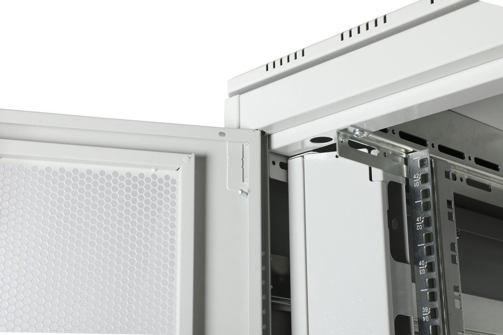 Los armarios de red de la serie Unique se han diseñado y fabricado para un cableado de red especialmente cómodo y flexible. Las sofisticadas optimizaciones ofrecen una estabilidad acorde con el mercado con la máxima flexibilidad. Un chasis base modular, que puede abrirse mediante paneles ciegos atornillados de 483 mm (19"), ofrece espacio suficiente para cables de todo tipo. Además, hay entradas de cables laterales con escobillas en la parte superior e inferior del armario, así como otra en la parte trasera del chasis base. Los generosos conductos de cables verticales con ayudas y tapas para el guiado de cables, instalados en la parte delantera (a partir de 800 mm de ancho de armario), completan a la perfección las versátiles características del armario de red. En el interior hay instalados dos pares de raíles de perfil de 483 mm (19") galvanizados y con manivela, etiquetados con unidades de altura que pueden leerse en direcciones opuestas. Se pueden ajustar de forma continua y están conectados a puntales de profundidad adicionales en el armario. Cada armario es una robusta construcción de chapa de acero de hasta 1,5 mm de grosor. La coloración se realiza mediante recubrimiento electrostático en polvo en los colores estándar gris (RAL 7035) y negro (RAL 9005). Los paneles laterales y las puertas modulares bloqueables y desmontables mejoran la accesibilidad. Las bisagras de las puertas se pueden cambiar. Además, los armarios pueden desmontarse completamente en caso necesario gracias a su diseño desmontable. Dependiendo de la aplicación, todos los armarios de red DIGITUS® Unique pueden utilizarse también como armarios para servidores, teniendo en cuenta factores como los pesos y el desarrollo de calor de los componentes incorporados. La instalación de puertas de chapa de acero perforada en dichas variantes garantiza una mejor refrigeración pasiva de los componentes instalados. Un modelo definido por DIGITUS® como armario para servidores se complementa, por ejemplo, con soportes traseros para PDU en la configuración estándar de la serie Unique Server-N.