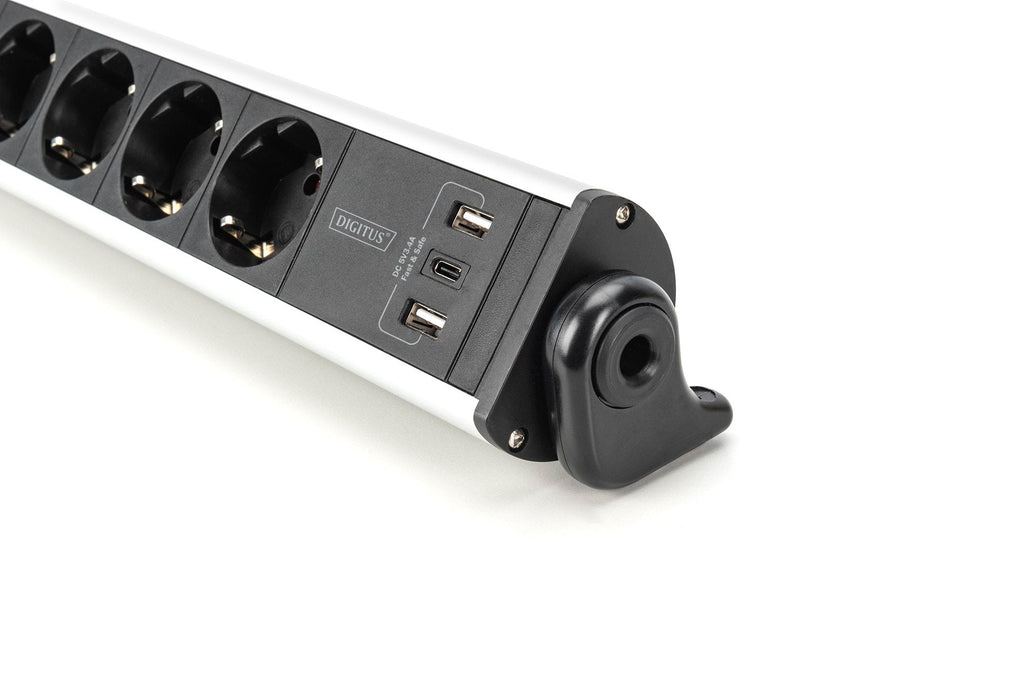 Olvide aquellos tiempos cuando tenía que buscar continuamente el cargador de su smartphone. La regleta de enchufes para la oficina de DIGITUS® le ofrece nada menos que 3 puertos USB en los que puede cargar, por ejemplo, a la vez su smartphone y su tableta. Puede utilizar todas las tomas de corriente con contacto de puesta a tierra sin problemas de conexión. La inteligente disposición decalada en 45° de las tomas de corriente permite utilizar incluso fuentes de alimentación de mayor tamaño y clavijas acodadas voluminosas sin bloquear o cubrir las tomas de corriente contiguas. Además, tiene la posibilidad de colocar la regleta de enchufes de manera variable y, si es necesario, adaptarla perfectamente a su emplazamiento con la ayuda de la fijación a presión enchufable en ambos lados. Una vez que se haya sujetado, la regleta se puede girar horizontalmente para garantizar la flexibilidad óptima. Protéjase a sí mismo y a su familia de descargas eléctricas mediante los cierres integrados que aseguran una mayor protección contra el contacto en los enchufes con contacto de puesta a tierra. El cable de alimentación de 1,5 m le ofrece suficiente libertad para posicionar la regleta de enchufes según sus deseos. La carcasa de aluminio de alta calidad completa el diseño elegante de esta regleta de enchufes multifunción.