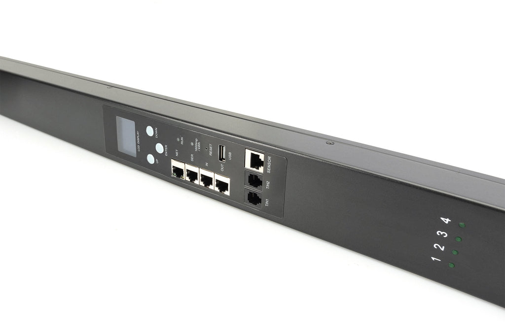 La Smart PDU de DIGITUS® le permite la vigilancia remota de intensidad, tensión, consumo energético total, potencia total y factor de potencia en el nivel de entrada, así como intensidad, potencia y consumo energético en el nivel de salida. Se puede ajustar el valor límite para la corriente total y la alarma advierte de posibles sobrecargas del sistema. También permite la vigilancia del estado operativo, así como la intensidad, la energía y la potencia a nivel del interruptor automático. De esta manera es posible gestionar y distribuir eficientemente la corriente. El dispositivo se puede activar y configurar a través de interfaces web, SNMP y Telnet. Con la opción de conectar sensores, la unidad puede formar un sistema completo para la vigilancia del entorno para controlar la temperatura, la humedad, humo y eventuales fugas en los bastidores. Hasta cinco regletas de enchufes que comparten la misma conexión de red y dirección IP se pueden conectar en fila. Asimismo, la PDU se puede integrar fácilmente en bastidores con la ayuda de opciones de instalación sin herramientas.