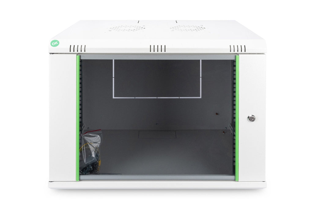 Los armarios de red murales de la serie Dynamic se han desarrollado para ampliar la red de forma sencilla y especialmente rentable. El techo, la base y el panel trasero de cada armario están equipados con una entrada de cables pretroquelada. El chasis del techo también está provisto de una zona troquelada para alojar un módulo de ventilador. En el interior hay instalados dos pares de raíles perfilados galvanizados de 483 mm (19"), etiquetados con unidades de altura legibles en ambas direcciones. Estos pueden ajustarse en profundidad. Cada armario es una robusta construcción de chapa de acero de hasta 1,5 mm de espesor. La coloración se realiza mediante recubrimiento electrostático en polvo en los colores estándar gris (RAL 7035) y negro (RAL 9005). Los paneles laterales extraíbles y la puerta delantera con cerradura y extraíble mejoran la accesibilidad. Las bisagras de la puerta se pueden cambiar. El montaje en la pared se realiza en dos sencillos pasos: La placa de montaje suministrada se atornilla a la pared y luego se conecta a la carcasa.