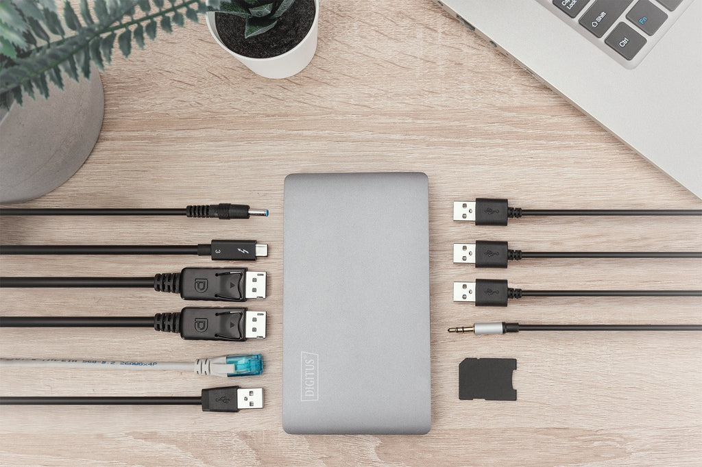 La estación de acoplamiento Thunderbolt™ 3 de DIGITUS® amplía su notebook con 11 puertos adicionales a través de una sola conexión USB-C™. Dispone, entre otros, de 2 puertos de vídeo DisplayPort para la conexión de un monitor, un proyector y un televisor. Gracias al Dual Monitor Support, estos se pueden utilizar simultáneamente. Bajo Windows, una señal de vídeo se puede emitir a los dos puertos de vídeo a la vez (modo SST); además, se pueden emitir 2 señales de vídeo distintas a los 2 puertos de gráficos (modo MST). Bajo Mac OS solo se soporta el modo SST. Las demás interfaces le ofrecen una conectividad con todas las conexiones necesarias que debe proporcionar una estación de acoplamiento moderna. Por ejemplo, una conexión de red, conexiones USB adicionales (USB-C™, USB-A), una salida de audio y dos lectores de tarjetas independientes. A través del puerto USB-C™ integrado con PD Charging puede cargar su ordenador portátil durante el uso de la estación de acoplamiento. Asimismo, la estación de acoplamiento ofrece diversos puertos USB-C y 3.0 para la transmisión de datos, la conexión de equipos periféricos, tales como un ratón y un teclado, así como para la carga de dispositivos móviles. Saque más rendimiento de su notebook y amplíe sus posibilidades: solo necesita una conexión USB-C™ libre.
