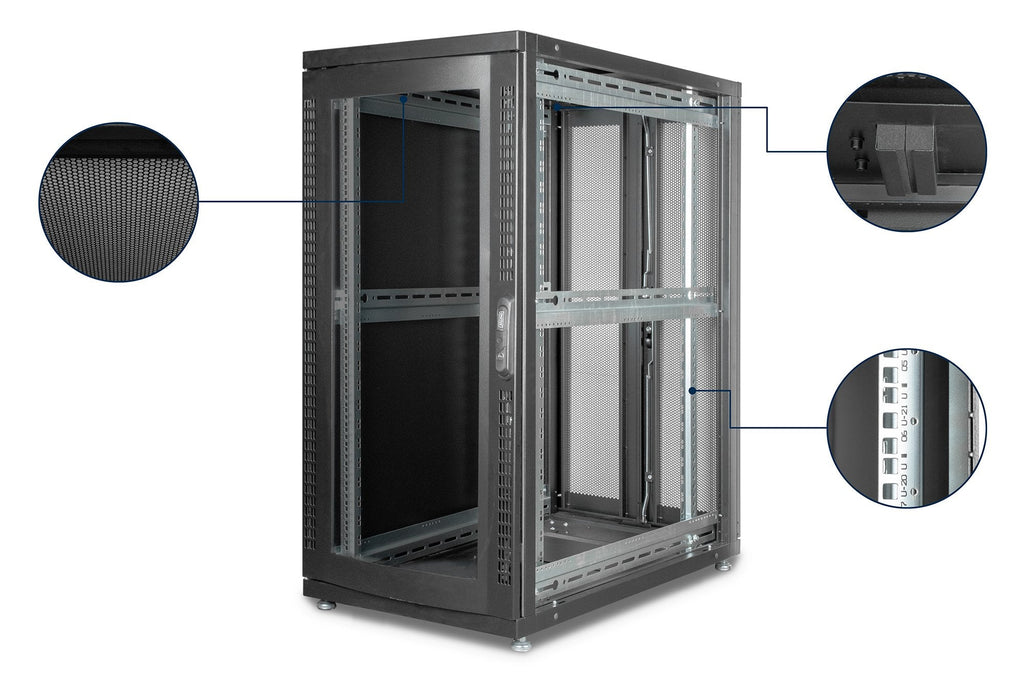 Los armarios de servidor de la serie Unique han sido desarrollados para un cableado de redes particularmente cómodo y flexible. Las entradas equipadas con cepillos en los laterales del techo y la base (a partir de un ancho del armario de 800 mm), una entrada deslizante con junta de caucho celular, así como una entrada posterior adicional con tira de cepillo en el chasis de base, permiten un uso versátil con los escenarios de aplicación más diversos. Las puertas frontales perforadas de una hoja y las puertas posteriores perforadas de dos hojas que incluyen un asa abatible con semicilindro perfilado mejoran la circulación del aire. El techo está equipado con una cubierta perforada, fijada por encima de una construcción para el alojamiento sencillo de un módulo de ventilación. En el interior están instalados dos pares de guías de perfil de 483 mm (19") galvanizadas y rotuladas con unidades de altura legibles desde ambos lados. Se pueden regular en profundidad y están conectadas con elementos de profundidad adicionales en el armario. Cada armario es una robusta construcción de acero, hecha de chapa de acero con un grosor de hasta 2,0 mm. El proceso de pintado se realiza en forma de un recubrimiento de polvo electrostático en los colores estándar gris (RAL 7035) y negro (RAL 9005). Las paredes laterales modulares (con división horizontal a partir de 42UA) y puertas extraíbles y dotadas de cerraduras facilitan el acceso. Es posible cambiar de lado las bisagras de las puertas. Asimismo, el diseño desmontable de los armarios permite desarmarlos por completo si es necesario.