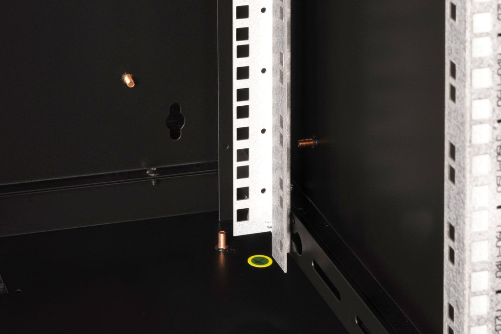 Los armarios de red para el montaje en la pared de la serie Unique han sido desarrollados para el cableado especialmente cómodo y flexible de redes. En el techo de cada armario se encuentra una entrada de cable deslizante con junta de caucho. El panel posterior y la chapa base están dotados de entradas para cables troqueladas con cubierta de plástico. Para el alojamiento de un módulo ventilador se incluye además una zona troquelada en el chasis de techo. En el interior está instalado dos pares de guías de perfil de 483 mm (19") galvanizadas y rotuladas con unidades de altura legibles desde ambos lados. Estas se pueden ajustar en profundidad. Cada armario es una robusta construcción de acero, hecha de chapa de acero con un grosor de hasta 1,5 mm. El proceso de pintado se realiza en forma de un recubrimiento de polvo electrostático en los colores estándar gris (RAL 7035) y negro (RAL 9005). Las paredes laterales modulares desmontables y con cerradura y la puerta frontal desmontable y con cerradura facilitan el acceso. Es posible cambiar de lado las bisagras de las puertas. El montaje en la pared se realiza en dos pasos sencillos: El bastidor de la carcasa se atornilla en la pared y se conecta después con la carcasa. Con las patas niveladoras o ruedas disponibles como opción, las carcasas de pared de la serie Unique también se pueden utilizar de forma independiente.
