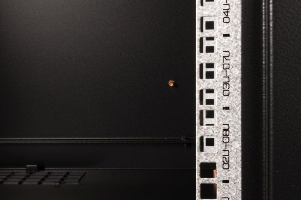 - Carriles de perfil de 483 mm (19'') instalados en la parte delantera y trasera del armario, galvanizados