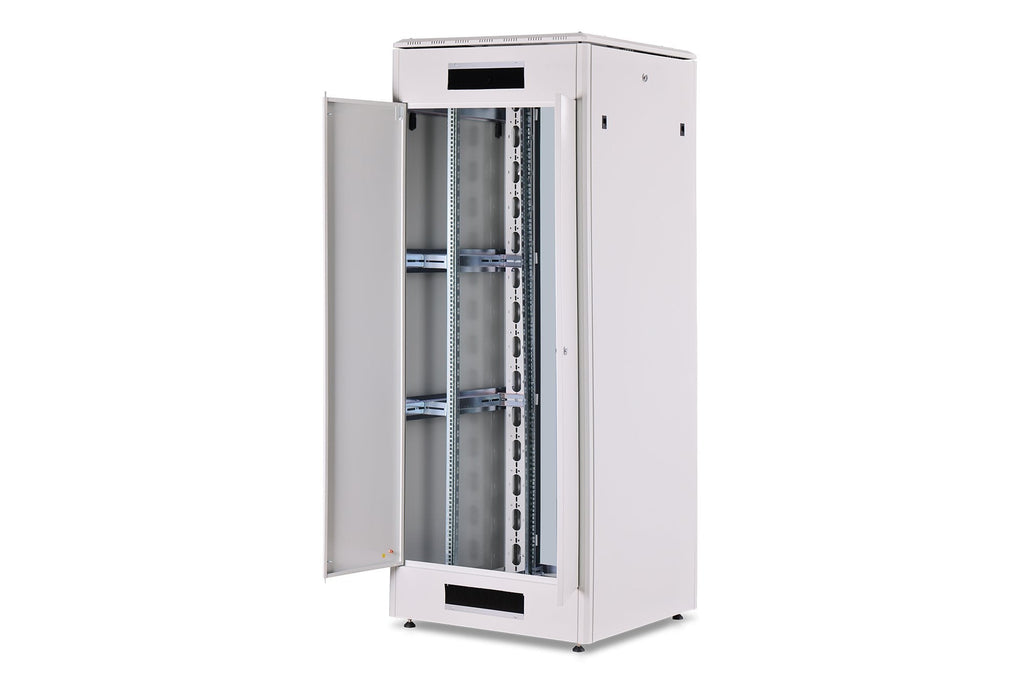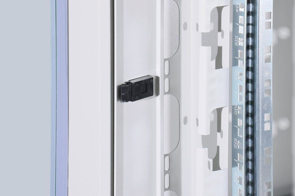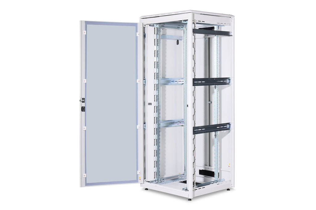 Los armarios de red de la serie Unique se han diseñado y fabricado para un cableado de red especialmente cómodo y flexible. Las sofisticadas optimizaciones ofrecen una estabilidad acorde con el mercado con la máxima flexibilidad. Un chasis base modular, que puede abrirse mediante paneles ciegos atornillados de 483 mm (19"), ofrece espacio suficiente para cables de todo tipo. Además, hay entradas de cables laterales con escobillas en la parte superior e inferior del armario, así como otra en la parte trasera del chasis base. Las regletas de escobillas traseras por encima y por debajo de la puerta trasera (a partir de 26U) permiten su uso en una amplia gama de escenarios de aplicación. Los amplios conductos de cables verticales con ayudas para el guiado de cables y tapa, instalados en la parte delantera (a partir de 800 mm de ancho de armario), completan a la perfección las versátiles características del armario de red. En el interior hay instalados dos pares de carriles de perfil de 483 mm (19") galvanizados y con manivela, etiquetados con unidades de altura que pueden leerse en direcciones opuestas. Se pueden ajustar de forma continua y están conectados a puntales de profundidad adicionales en el armario. Cada armario es una robusta construcción de chapa de acero de hasta 1,5 mm de grosor. La coloración se realiza mediante recubrimiento electrostático en polvo en los colores estándar gris (RAL 7035) y negro (RAL 9005). Los paneles laterales y las puertas modulares con cerradura y extraíbles mejoran la accesibilidad. Las bisagras de las puertas pueden cambiarse. Además, los armarios pueden desmontarse completamente en caso necesario gracias a su diseño desmontable.