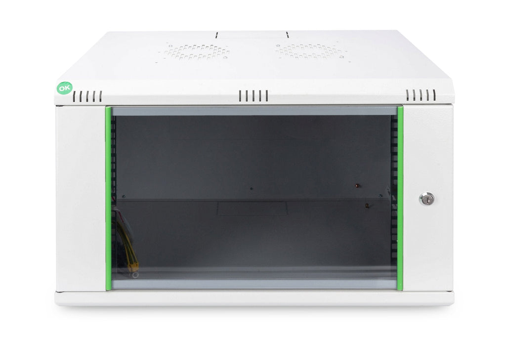 Los armarios de red para el montaje en la pared de la serie Dynamic han sido desarrollados para la ampliación sencilla y especialmente económica de redes. El techo, la base y la pared trasera de cada armario poseen una entrada para cables pretroquelada. Para el alojamiento de un módulo ventilador se incluye además una zona troquelada en el chasis de techo. En el interior están instalados dos pares de guías de perfil de 483 mm (19") galvanizadas y rotuladas con unidades de altura legibles desde ambos lados. Estas se pueden ajustar en profundidad. Cada armario es una robusta construcción de acero, hecha de chapa de acero con un grosor de hasta 1,5 mm. El proceso de pintado se realiza en forma de un recubrimiento de polvo electrostático en los colores estándar gris (RAL 7035) y negro (RAL 9005). Las paredes laterales desmontables y la puerta frontal desmontable y con cerradura facilitan el acceso. Es posible cambiar de lado las bisagras de las puertas. El montaje en la pared se realiza en dos pasos sencillos: La chapa de montaje se atornilla en la pared y se conecta después con la carcasa.