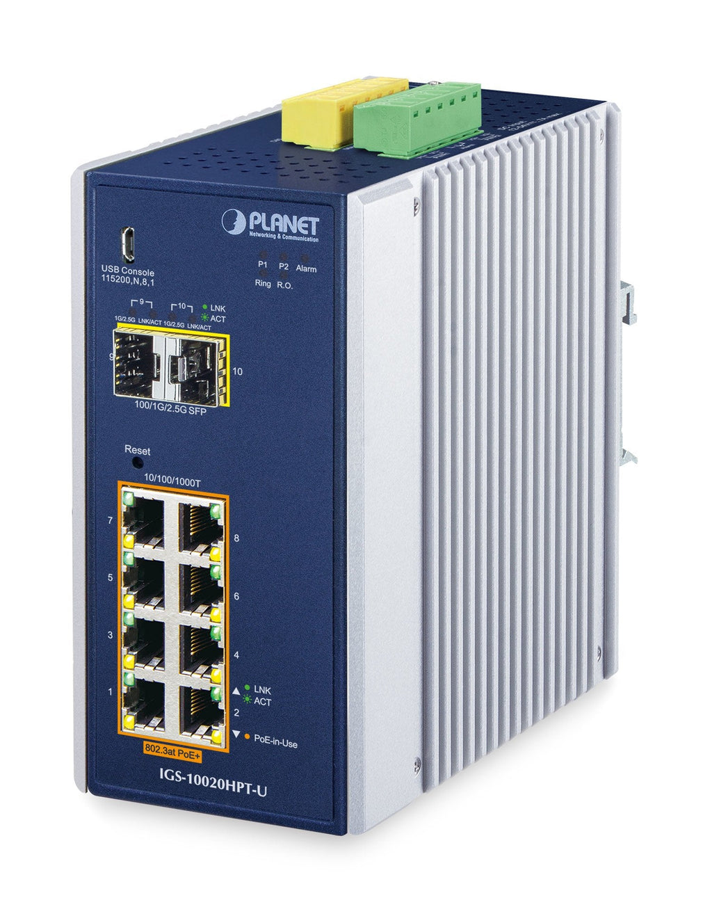 PLANET DIN-Rail L2+/L3 Manageable Gestionado L2+ Gigabit Ethernet (10/100/1000) Energía sobre Ethernet (PoE) Aluminio, Azul