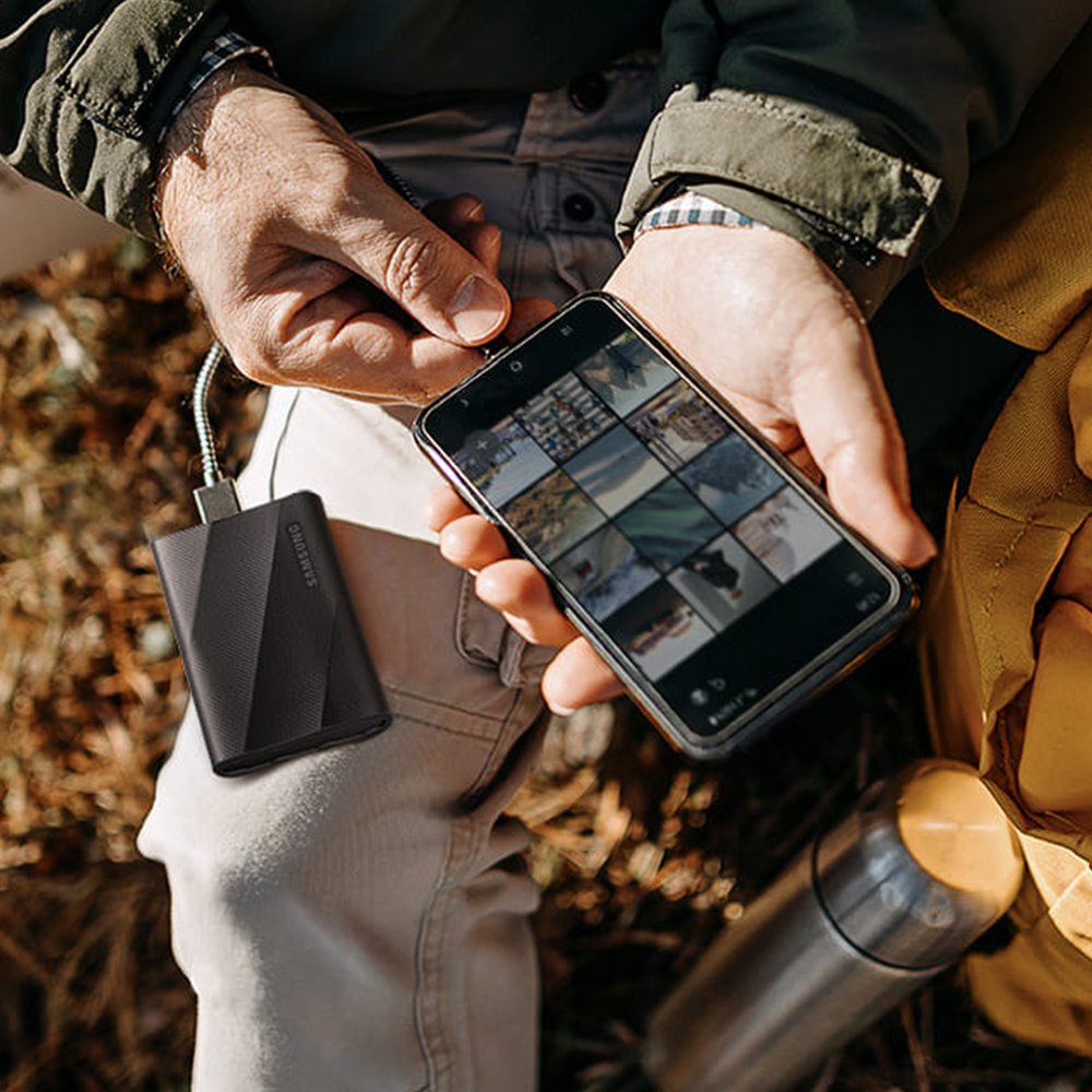 T9 está disponible en versiones de 1TB, 2TB y 4TB para ofrecerte mucho espacio de almacenamiento en un formato compacto y ligero de solo 122 g de peso. Gracias a su acabado rugoso y antideslizante, puedes llevarlo en la mano con total seguridad y comodidad.