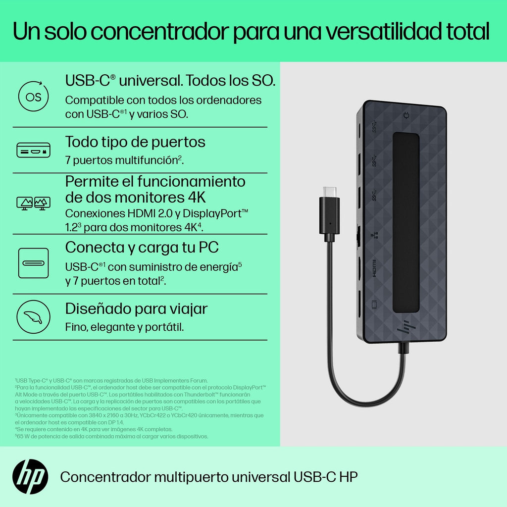 Desbloquea nuevas posibilidades con el concentrador multipuerto universal USB-C HP, ahora compatible con cualquier ordenador con USB-C®. 7 puertos, 1 cable de suministro de energía para alimentación y datos y muchos periféricos para conectarlos como quieras. También es compatible con dos monitores 4K vía HDMI 2.0 y 1 DisplayPort™ 1.2. Este concentrador es todo lo que necesitas para estar conectado.