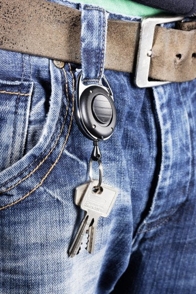Cordón extensible ovalado con clip y llavero metálico. Incluye una potente lámpara led para iluminar las cerraduras en la oscuridad.