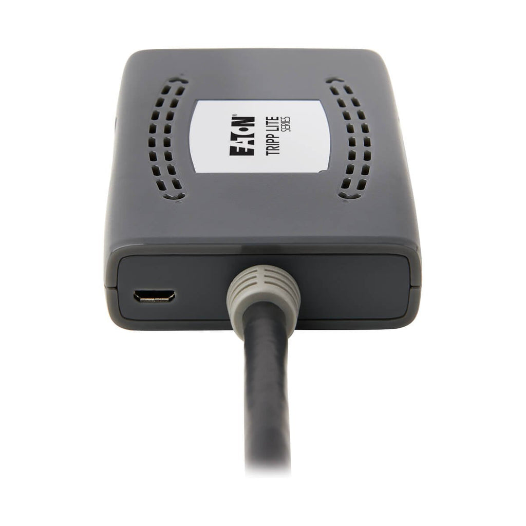 El B118-002-HDR-V2 para conectar y usar no requiere software o controladores adicionales. Un cable HDMI incorporado se conecta con el dispositivo fuente. Conecte sus pantallas HDMI al divisor con los cables HDMI suministrados por el usuario (como la Serie P569 de Tripp Lite) y conecte el cable USB Micro-B incluido a un cargador USB de pared o un puerto USB en la fuente para iniciar. Un LED verde indica que la unidad está recibiendo energía y un LED naranja muestra las entradas HDMI conectadas.
