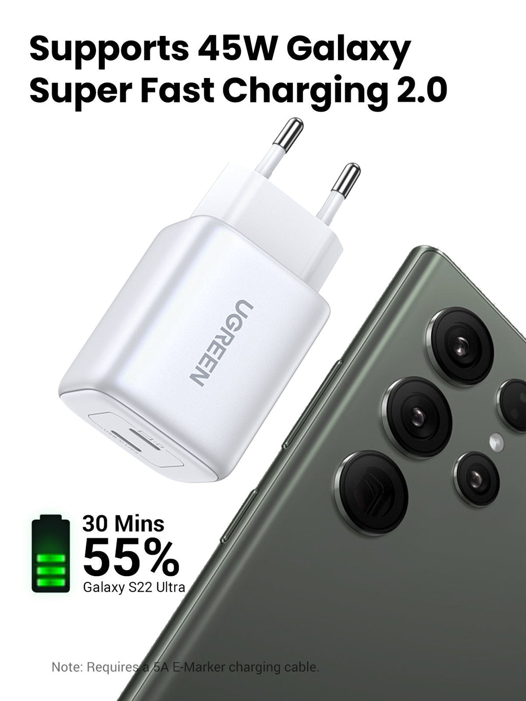 [ Super Fast Charging 2.0 para Galaxy ] Oferece potência total de 45 W ao usar uma única porta, o carregador UGREEN de 45 W é compatível com Samsung Super Fast Charging 2.0 de Galaxy S24 Ultra/ S23 Ultra/ S22 Ultra e Galaxy S8 / S7, etc. .