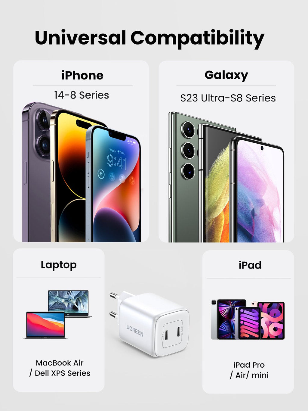 [Compatibilidade universal] UGREEN adaptador de corrente USB C é compatível com o Google Pixel 8/7 Pro/7/6a; iPhone 16 Plus Pro Max, 15/ 14/ 13/ 12 séries; MacBook Air M2/M1; iPad Pro/ar/mini; Air; Air; Air; Air; Air; Air; Air; Air; Air; Air; Air; Air; Air; Air; Air; Air; Air; Air; Air; Air; Air; Air; Air; Air; Air; APods Pro. ; Galaxy S24/S24+/ S24 Ultra/ S23 Ultra/S23/S22/S22+/Ultra, S21 FE, S20FE; Z Flip, nota 10/9, A72, A71, A53, A52, A50, Tab A8/A7, S8 /7/6, Galaxy Fold 2; Redmi Nota 10/11/9/8; Xiaomi Poco F3, X3, M3; portátil XPS 13, Steam Deck, Switch.