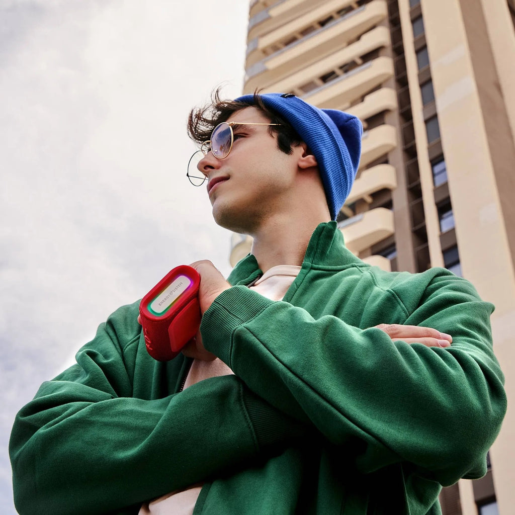 Altavoz portátil con certificado IPX6 de resistencia al agua y luces LED RGB que transforman cualquier lugar en una fiesta. Disfruta de tu música sin preocupaciones.