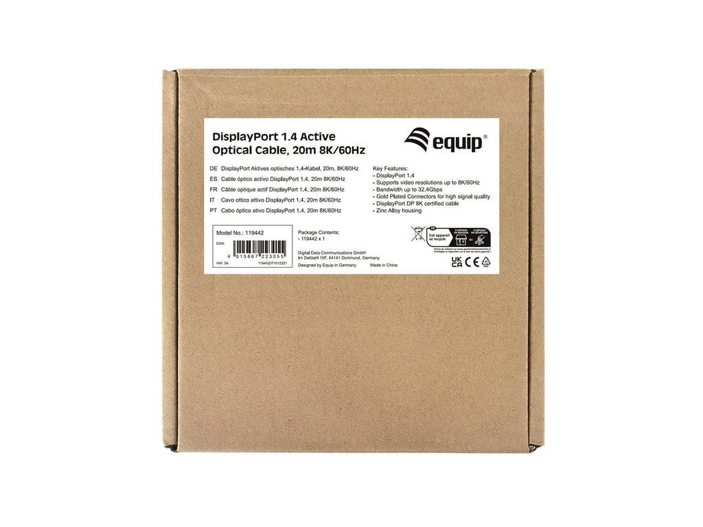 "El equipo 119442 DisplayPort 1.4 Active Optical Cable (AOC) es un cable de alto rendimiento utilizado para transmitir señales de vídeo digital a largas distancias. A diferencia de los cables de cobre, que tienen limitaciones en cuanto a la distancia a la que pueden transmitir señales sin degradación de la señal, DisplayPort 1.4 AOC puede transmitir datos hasta 100 metros sin necesidad de amplificadores o repetidores de señal adicionales.