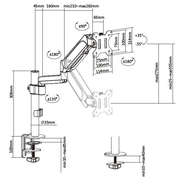 El soporte es fácil de instalar y se sujeta al escritorio, lo que ahorra un valioso espacio de trabajo. Sus brazos articulados proporcionan una amplia gama de movimientos, lo que le permite colocar el monitor a la altura y en el ángulo perfectos para sus necesidades. La estructura de resorte de gas añade un nivel de flexibilidad y precisión a la colocación del monitor, mejorando la comodidad y la productividad. Con su construcción duradera y diseño elegante, este soporte es una excelente opción para crear una estación de trabajo más ergonómica y organizada."